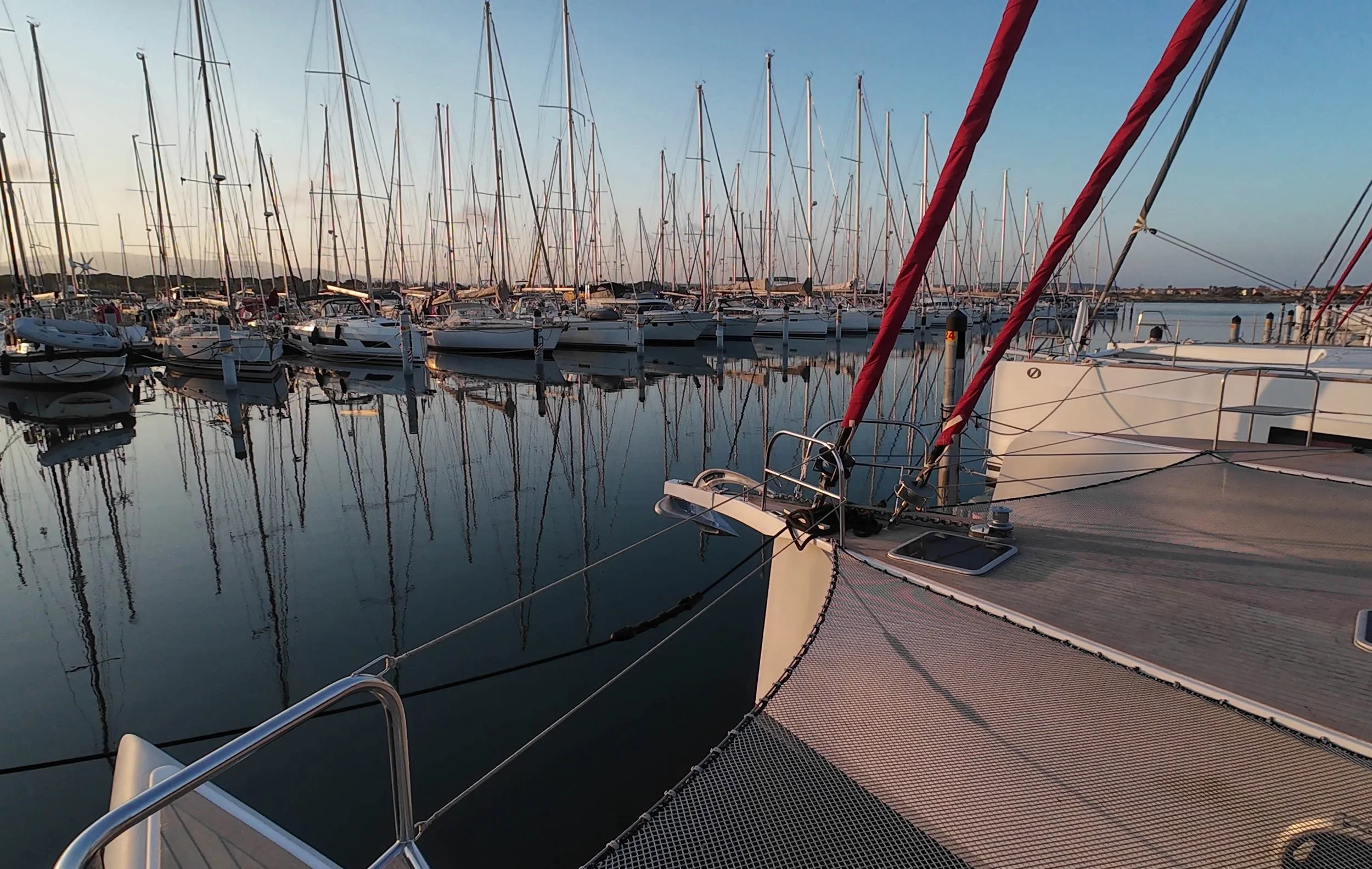 The marina itself is spacious, safe and located around the main parts of the town. There are two big chandleries, a sail loft and a number of smaller engine, electric, maintenance and painting companies. The Capitainnerie are helpful, and will give you access to the two large, clean ablutions blocks through the use of an app and bluetooth connection. It works well but you do need a mobile signal. Electricity and water to every berth, laundrette by the Capitainnerie. There is a 50 tonne travel lift, but it’s just slightly too narrow for us although will take most catamarans under 55 feet. The larger berths are generally pile berths - ie two stout piles at the entrance to each berth around which a mooring line is passed from the bow, or bows in the case of multihulls. We had not used this set up before, but after a little nervousness and talking it through with the berth concessionaire, it is perfectly possible to manage with just two people.