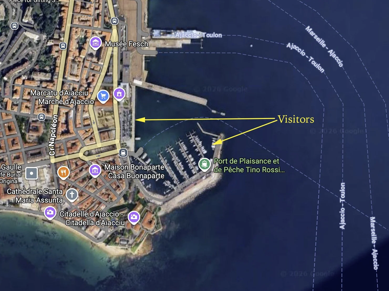 The port is snugly nestled just inside the imposing edifice of Ajaccio’s old citadel and very outer close to its historic centre. We had a berth here for 4 days in total to have unforeseen repairs done by the excellent Ajaccio Marine Centre located in the port. While the town quay berths are right in the heart of the action, the outer pontoons are more tranquil and it’s only a 5 minute walk around the harbour. Prices were reasonable at around 130 Euros a night, albeit in low season, and there’s a chandlery, two restaurants and a fuel station with shop on the outer harbour wall. Tino Rossi is smaller and less ‘touristy’ than the larger Charles Ornano port to the north, although this does boast bigger chandleries and more facilities,