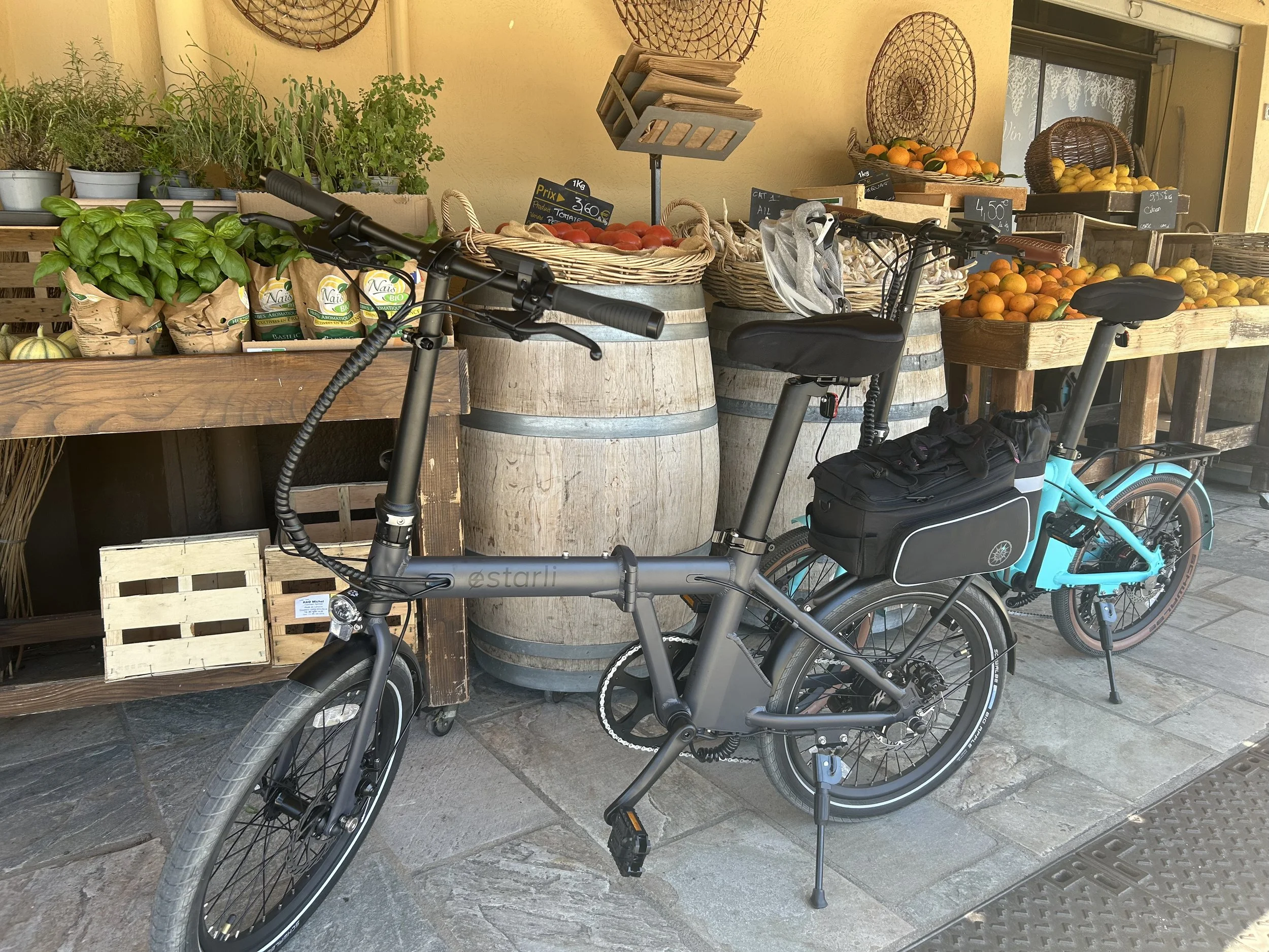 These have been a great purchase! We can explore further afield, use the really handy racks for panniers or smaller shopping loads, and they are comfortable enough to use for several hours without ‘numb bum’ setting in. They work on the ‘assisted pedalling’ principle; you have to pedal to get the electric assistance, which has 5 levels and can be turned off completely if you want an extra work out. The motors have sufficient oomph to make light work of steep, twisty roads up to hilltop villages and give a welcome boost to tired riders at the end of a long day. The bikes allow us to visit places that we’d otherwise have to hire a car to see, and we get some decent exercise into the bargain! We tend to use the lowest electric assist we can which means our range is pretty good; we can cover 40 miles on a single charge, more if we turn assist off on the flat and downhill.